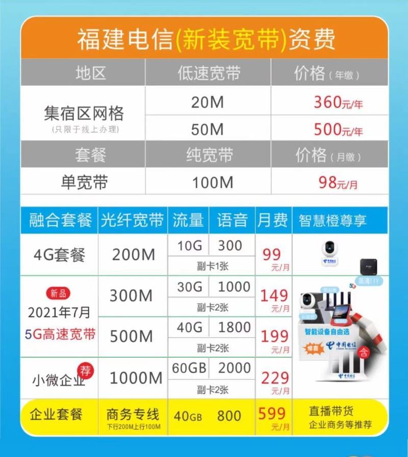 电信光纤宽带包月套餐: 79元一月:光纤200兆+全国语音300分钟+全国流量10G主副卡共享2张; 5G融合129元一月:光纤300兆+全国语音1000分钟+全国流量30G主副卡共享; 5G融合19...